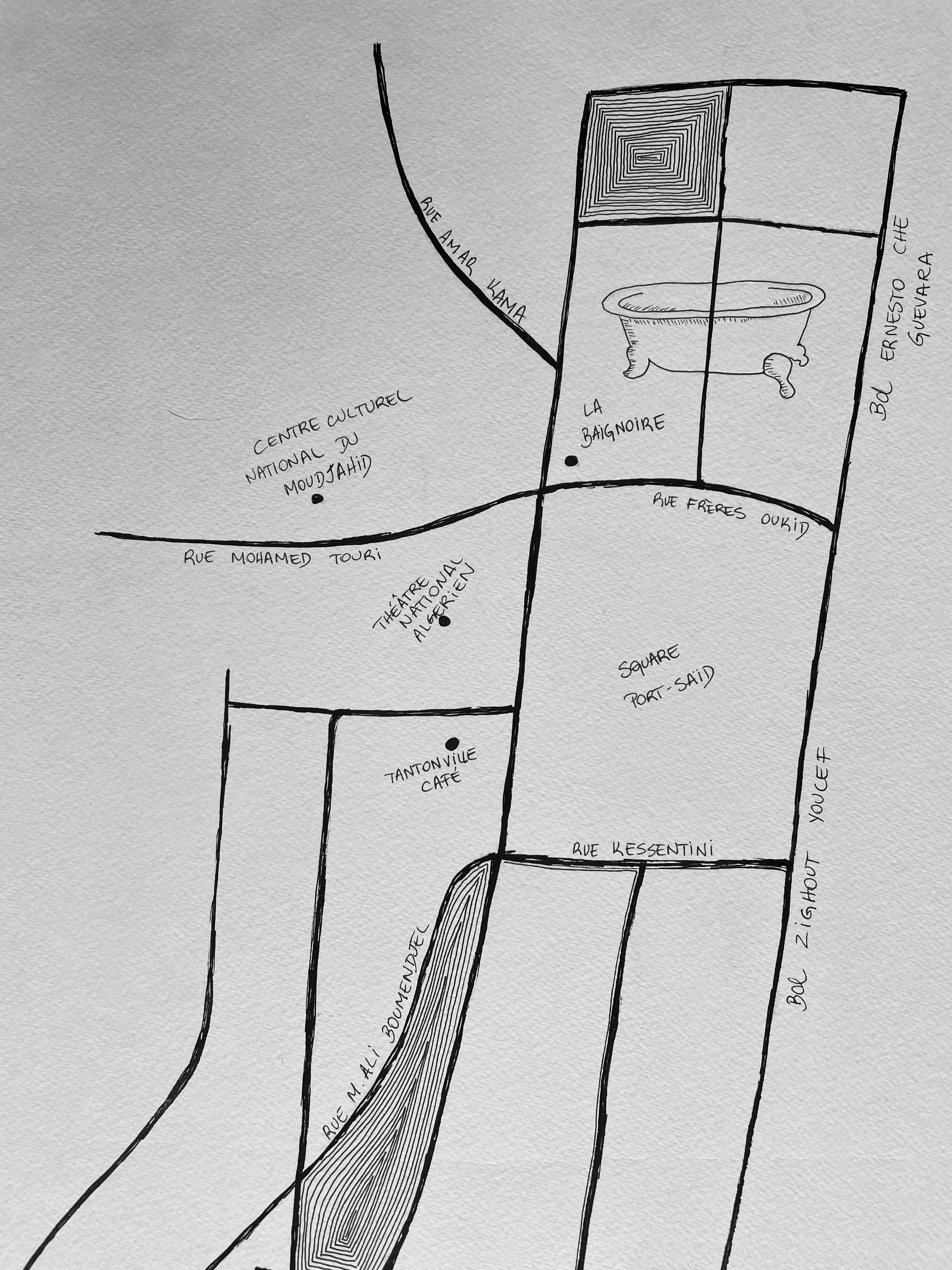 Três mapas, acompanhados de 15 fotografias realizadas ao longo de caminhadas pela cidade de Argel, dão contornos a experiência fabulativa de um corpo em deslocamento pelas paisagens urbanas da