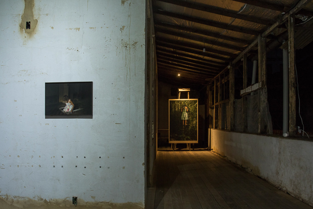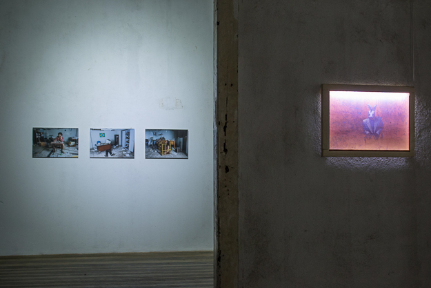 Alice e seus olhos arregalados desde os escombros do Palacete Faciola dão as boas-vindas ao fundo de um tango. O corpo tombado sobre caixas conforma A Cidade espelhada que se projeta para dentro das salas do antigo prédio do INSS e reverbera nas paredes do Casarão. Do sonho do vestido rosa, o coelho vermelho de terno em corpo humano. A síntese de universos complementares, também em cores.