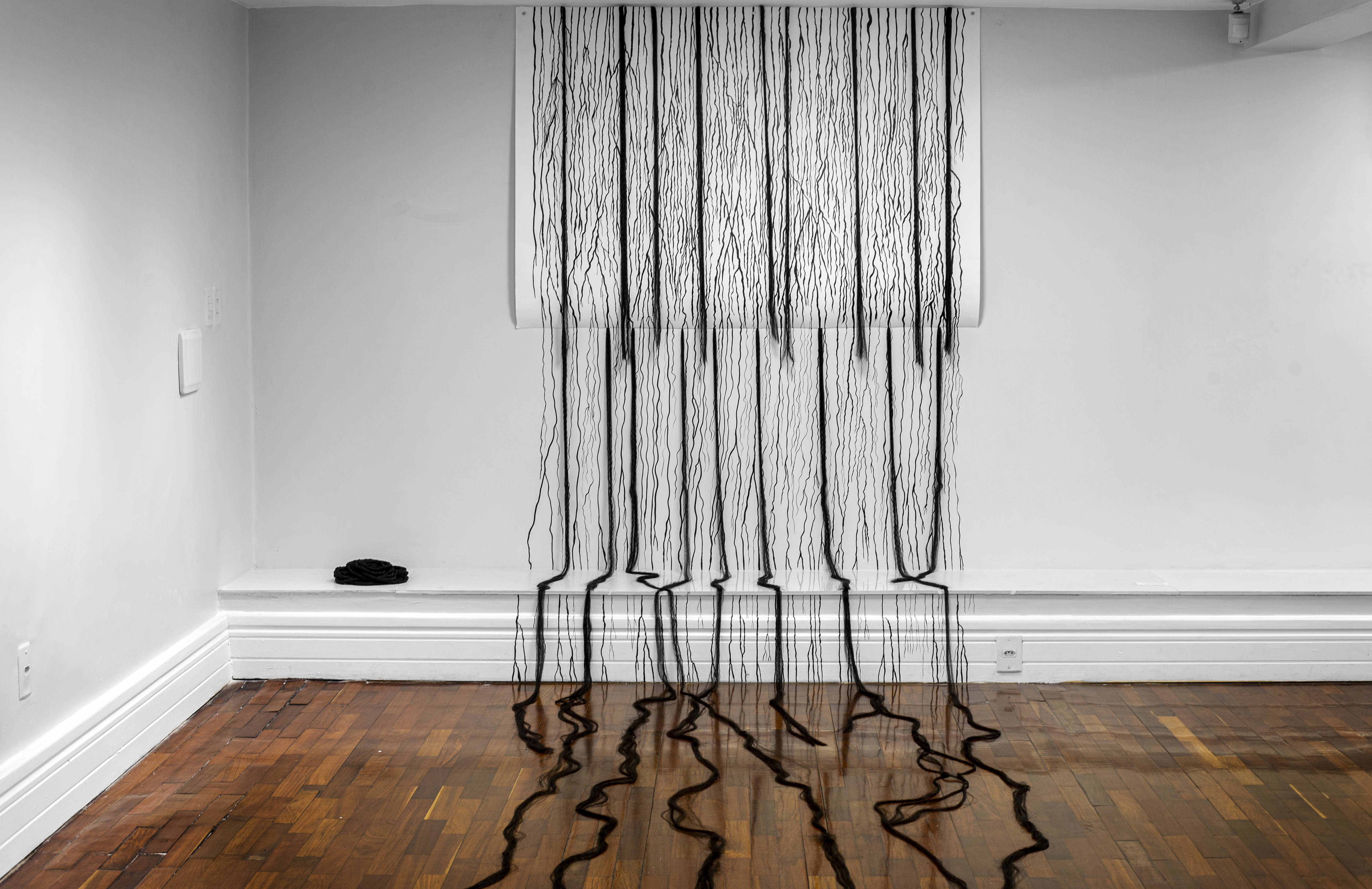 Nesta exposição, dou seguimento à investigação sobre a linha como material poético para pensar o desenho e o espaço. A série homônima que dá título à mostra nasce da imagem-semente do meu corpo fragmentado, estendido no chão. Os blocos em uma escala de cinzas viram quadrados em preto e branco sobre a superfície do papel. Estes multiplicam-se, ordenam-se, dialogam com linhas paralelas. Passam de um papel a outro em diferentes espessuras. Encontram harmonia mesmo em meio ao caos. Conformam paisagens urbanas, desérticas, paisagens humanas, epitélios, epidermes. Dialogam com séries de outros tempos, linhas em movimento duro em três possibilidades de construção de quadrado.Criam labirintos entre o fora e o dentro. Forjam pirâmides na repetição dos gestos. Expandem sequenciamentos. Encadeiam-se em fila, desalinham em oito quadrados. Rompem o bidimensional e ganham volume em superfície translúcida, na transparência do vidro.Linhas em branco sobre sete quadrados imperfeitos imprimem o rastro da mão em hesitação. Jogos de superfícies em sobreposição. Exercícios e experimentações. Linhas paralelas delineiam margens, traçam mapas do vazio em formas orgânicas. Formas partidas abrem linhas no espaço da ausência. Paralelos de linhas táteis em diferentes espessuras dividem o espaço, criam um duplo percurso permeável. Paisagens em espelhamento. Círculos em novas composições. Formas de ontem vestem-se de presente entre molduras e vidros aparentes. Linhas de enraizamento transbordam do papel do teto até o chão. Entrelaçam cursos, deságuam na busca por outro rios subterrâneos.
